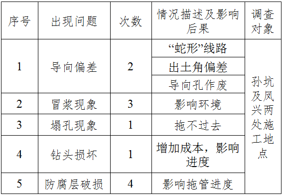 通过这次活动,使在海峰村、下径村段的定向钻施工中拖管一次通过率达到100%,出土点偏差不大规定20mm, 导向孔曲线偏差均在允许范围内,没有因为导向错误造成废孔,防腐层没有破损,由于及时更换钻头,没有出现钻头损坏现象,达到了预期效果,由于泥浆配比及泥浆泵操作规范化,没有了冒浆、塌孔现象,使周围的施工环境有了极大的改善。列表如下: