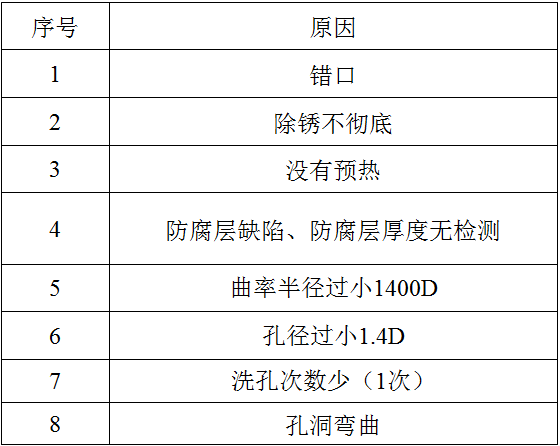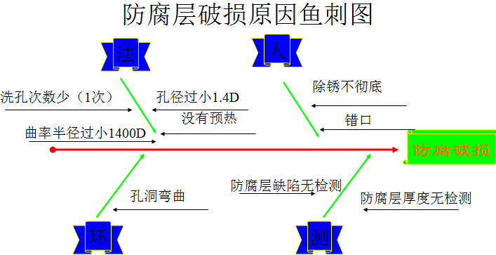 1)、人的因素:1、焊接时有错口现象。2、员工对钢管底部除锈打磨没有引起足够的重视,有锈渣造成防腐层粘着力差。