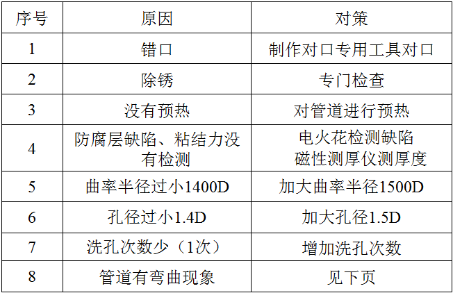 5)、定向钻穿越施工方案不合适:曲率半径过小,扩孔半径过小,出土角过大。