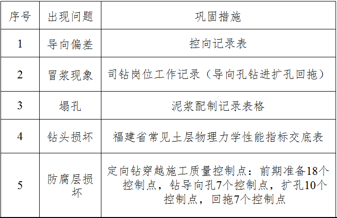 当一个好的方案、方法出来的时候,对效果的巩固很重要,即标准化、制度化。对此制定了与之对应的标准化的表格。使操作人员和监理人员在施工和监理过程中能够将QC小组的成果巩固下来,并且制定针对五个问题的专门巩固措施,进一步制定了定向钻施工HSE检查表。3个中间验收表格,三个批记录验收表,巩固了QC成果。
